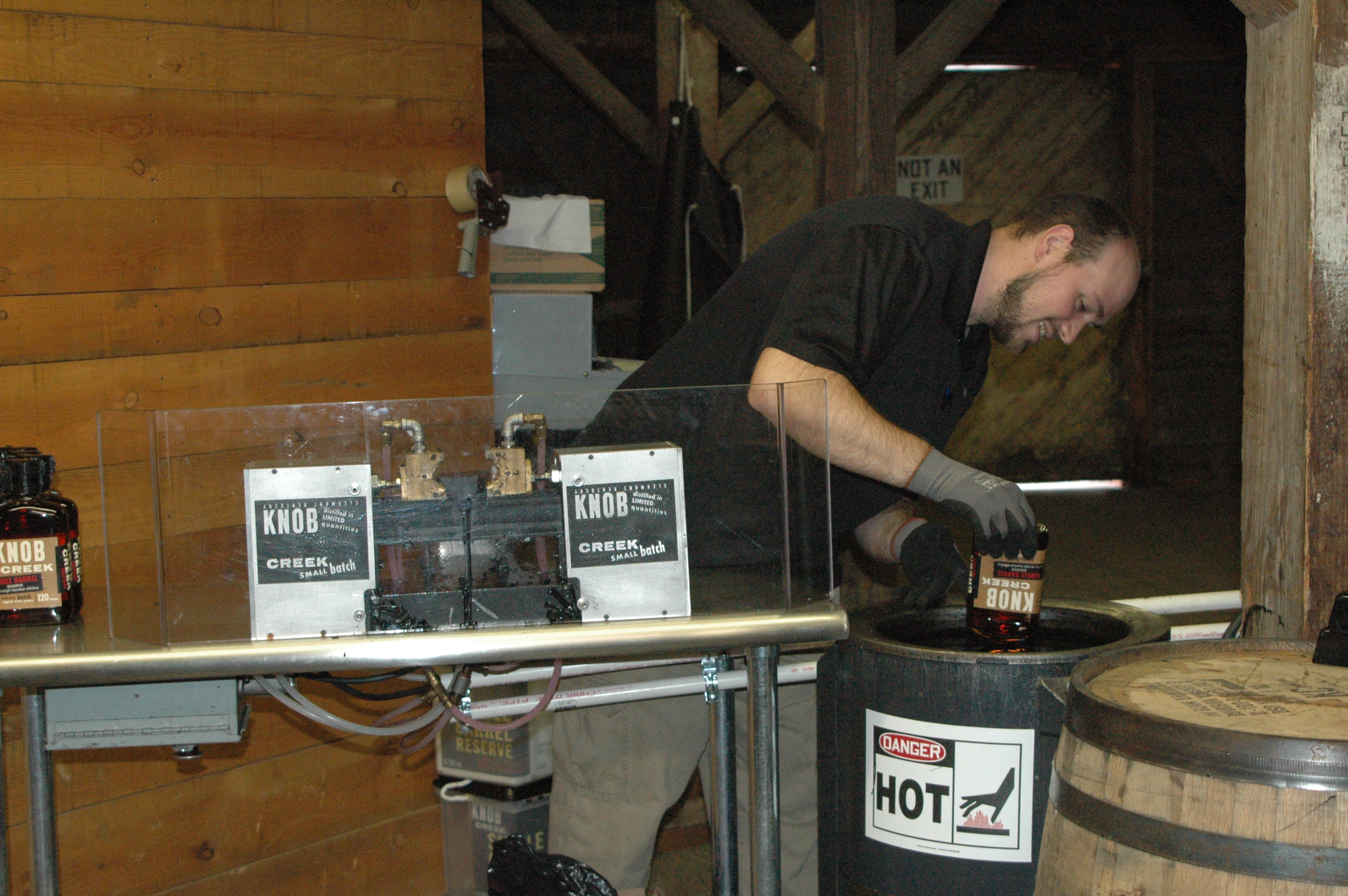 We were able to watch the bottling of the single batch of Knob Creek. Dan participated in the rinsing of the bottles. The bottles are not rinsed with water, only bourbon. You could then put a sticker with your initials on the bottle, and follow it along during the filling, labeling and hand dipping of the bottles. They only hand dip the single batch bottles. Then they will engrave the bottle with today’s date. Follow along on our bottle’s journey….