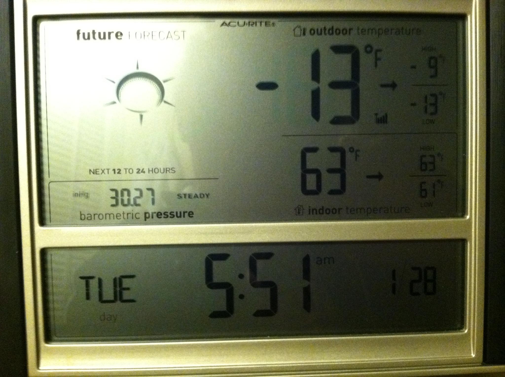 My sister sent me a photograph of their indoor/outdoor temperature gauge this morning. It is showing minus 13 degrees just before 6am today in Wauwatosa, WI. That is some dangerously cold weather, when you factor in the wind chill of 45 below!! We hope everyone back home stays safe and warm!!