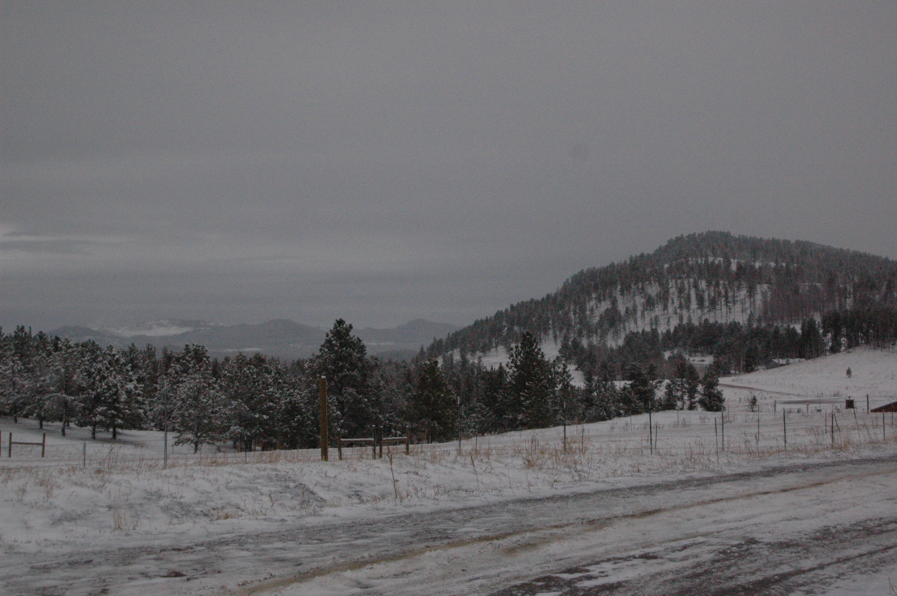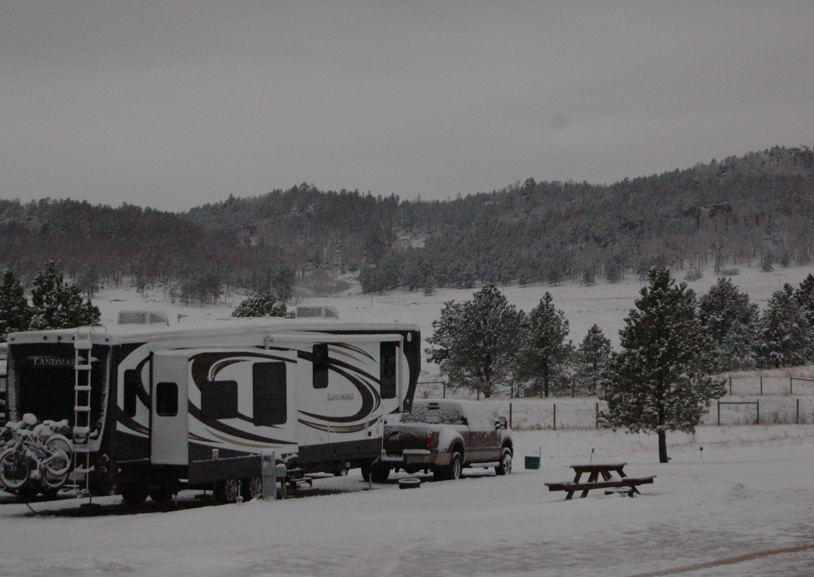 After 2 long days of driving (to stay ahead of the Winter Storm Watch), we arrived at Heritage Campground in Custer, SD in very heavy fog. Phil came over and welcomed us and we caught up on things since we last saw them at Amazon. Late Wednesday night it began snowing, and we were thankful we did not have to drive in the snow with the fifth wheel.