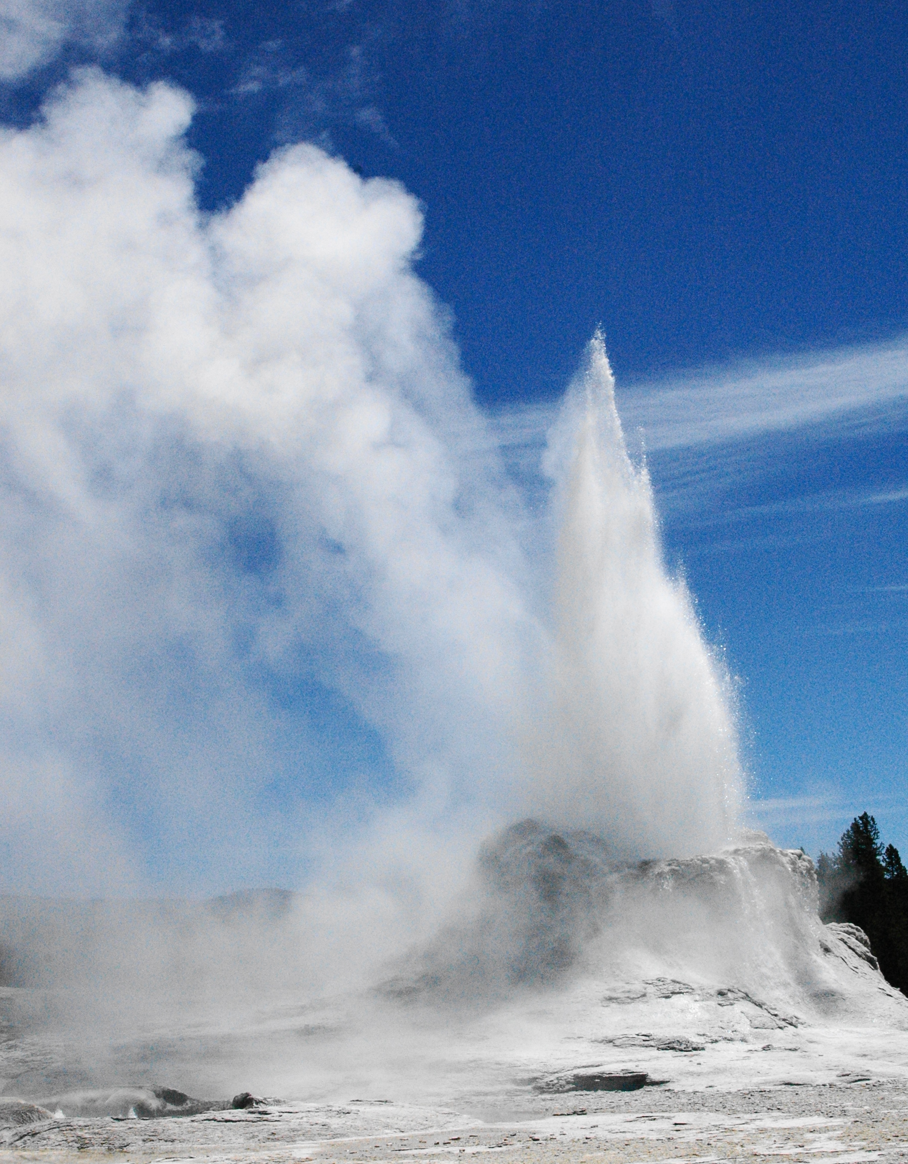 The Castle Geyser only erupts once every 13 hours (+/- 1 hour), and lasts 15-20 minutes for the water phase, followed by 30 minutes of steam. It reaches a height of 75 feet. A little after noon, the smaller pools around the “castle” started boiling, and soon the water started erupting, at first in small bursts, then in one large burst.