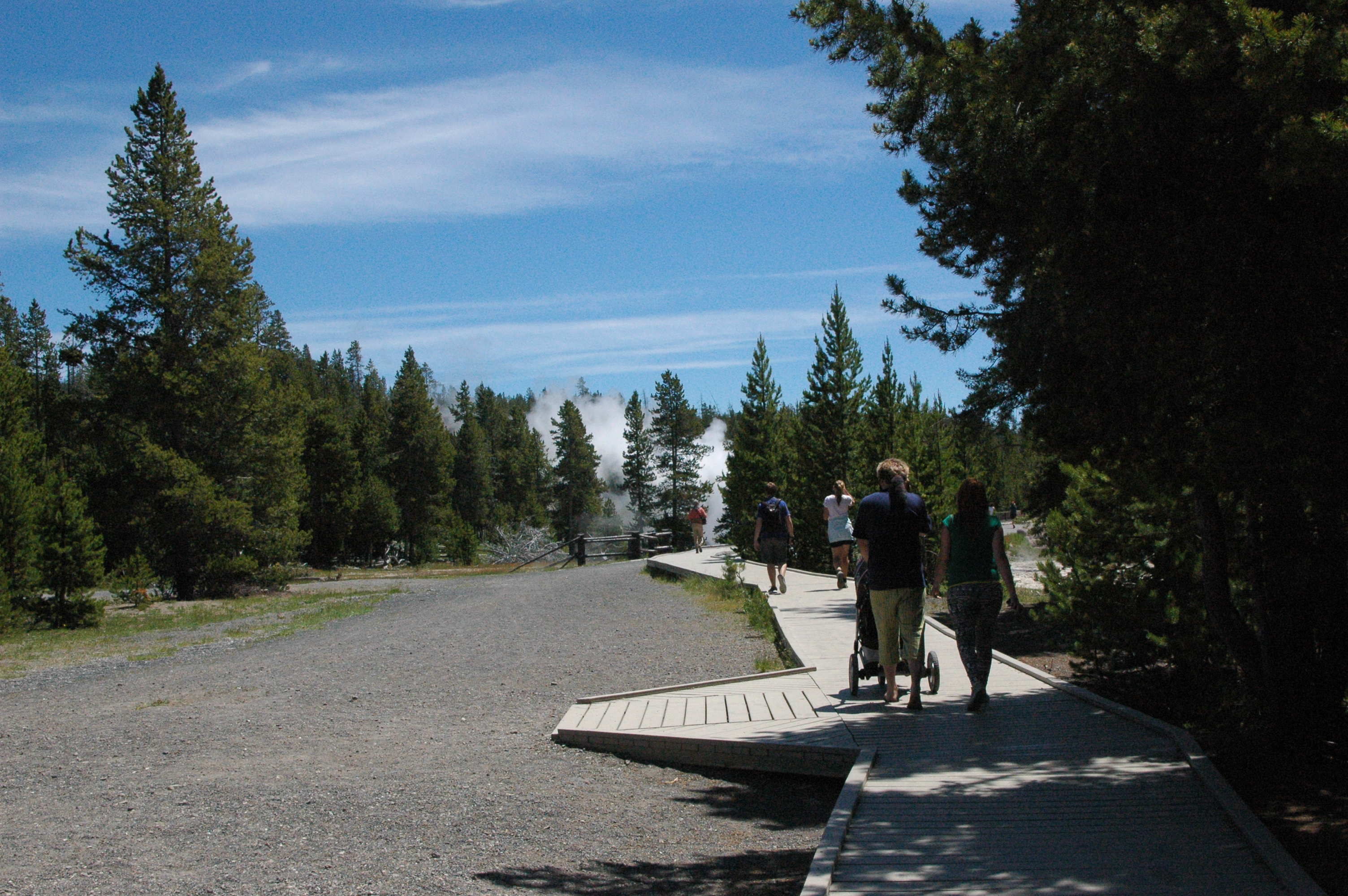 After a reasonably priced, and tasty meal at the Old Faithful cafeteria, we headed over to the Midway Geyser Basin to try to view the Grand Prismatic. At 370 feet in diameter, it is the largest hot spring in the park. It is also difficult to see, due to the constant steam (blue colored) floating up from the spring.