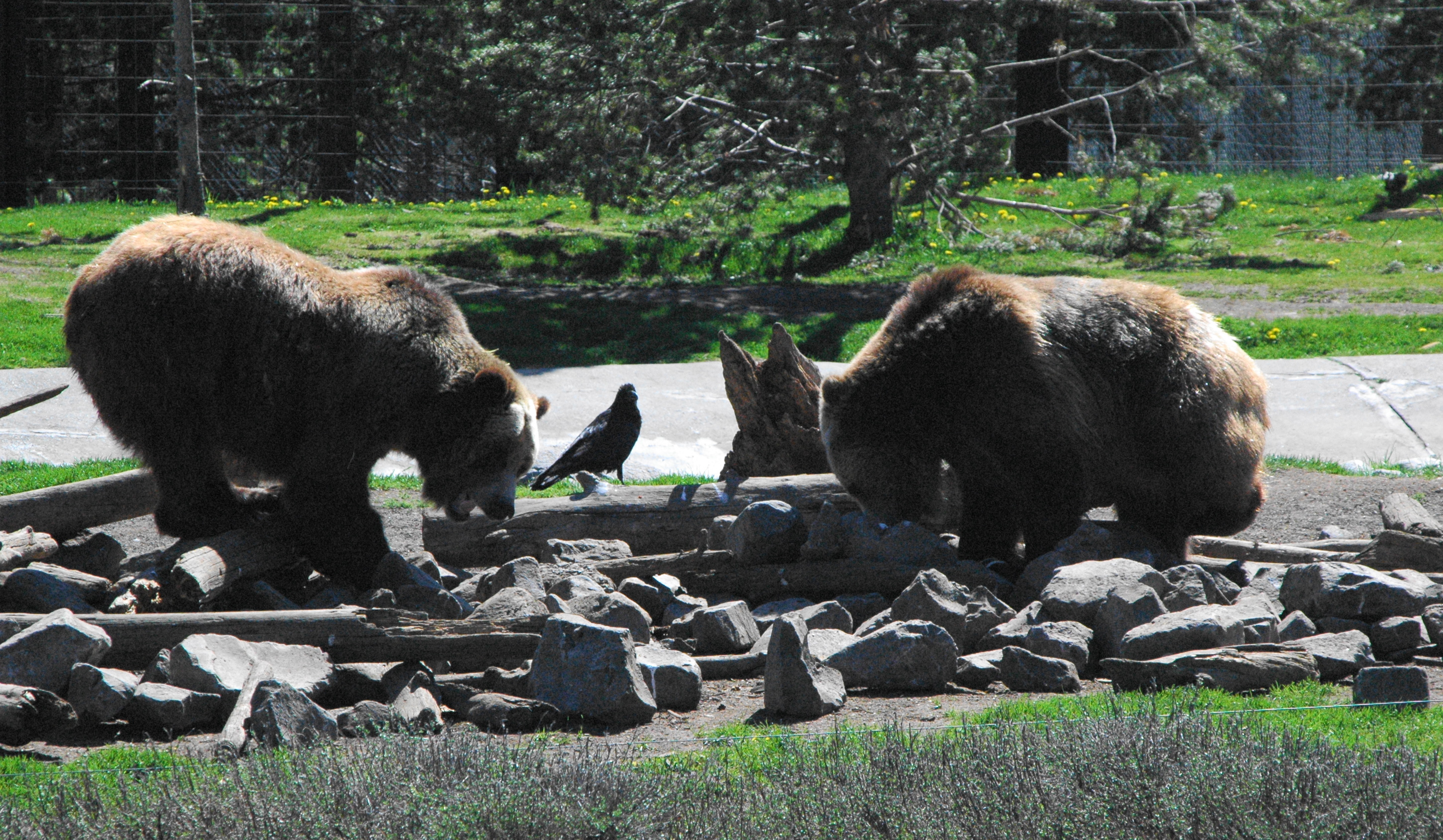 The bears are taken in and out of the bear habitat on a rotating basis. Before they switch out the bears, the staff will hide food under the rocks, and then a few bears will be let out to look for food. They have some nice sized grizzly bears on display. The ravens patiently wait by the bears and clean up all the scraps of food.