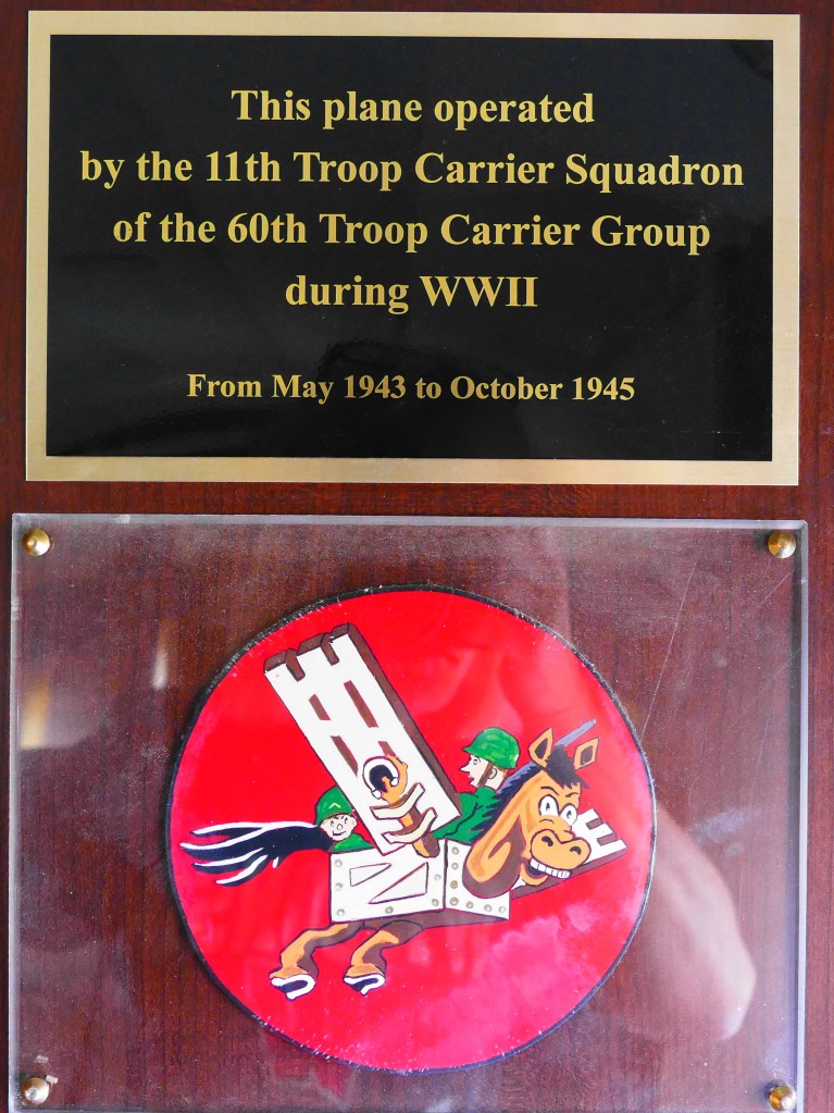 You are able to walk inside this plane. And we quickly realized why they may have it outside, with the windows open. It had a very strong odor of cigarette smoke. According to the plaque (see below), the plane was operated during WWII.