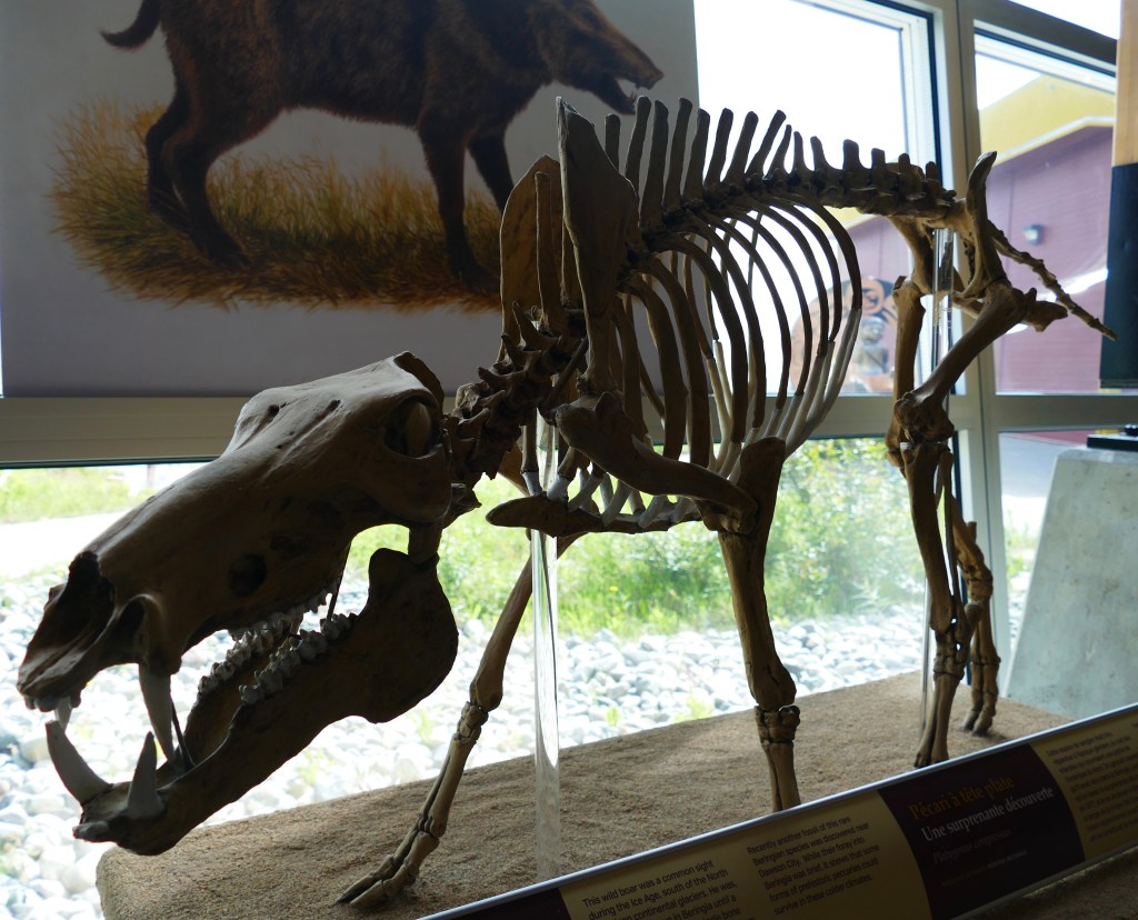 A single bone found in 1977 in northern Yukon was the first evidence that the wild bore (picture on wall behind the cast skeleton), a Flat-Headed Peccary, made it this far north in the America’s.