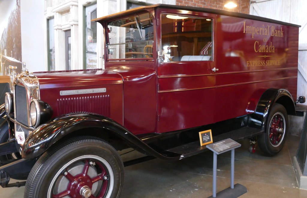 1927 GMC Sedan Delivery Vehicle. The Imperial Bank of Canada had a fleet of maroon vehicles. This one was used to deliver packages.