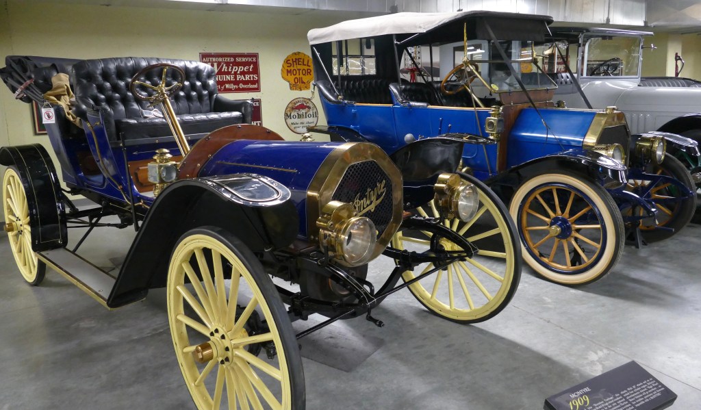 Below, on the left is a 1909 McIntyre Model M high wheel runabout. A 1911 Model 49 Overland is on the right.