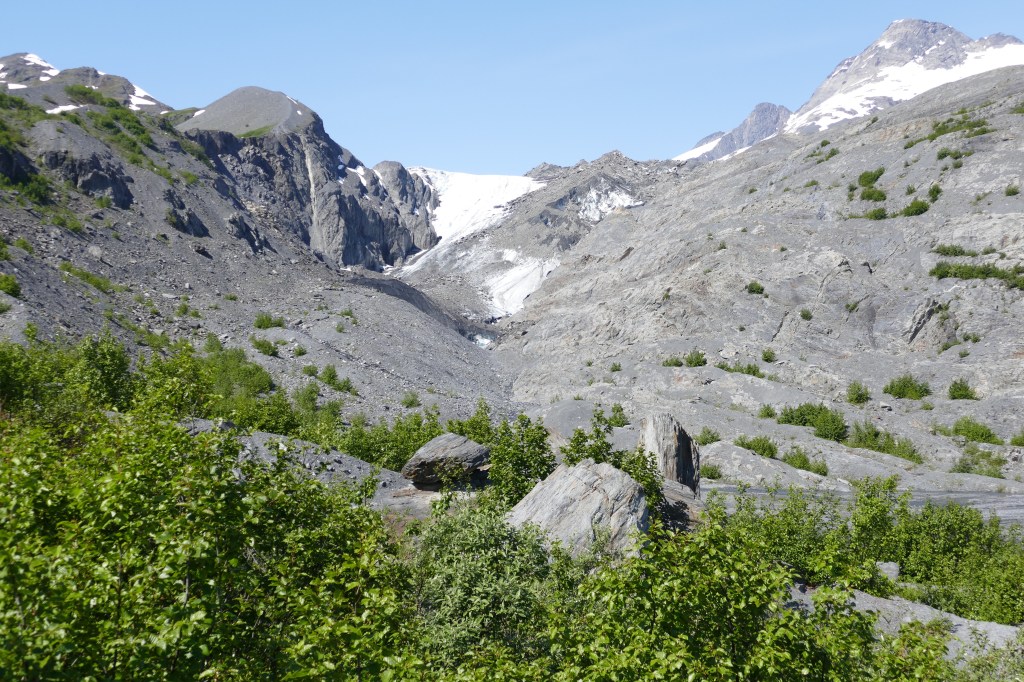 The town is perched right above the Kennicott Glacier and the Root Glacier. (Yes, the glacier and the town have two different spellings – one with an ‘i’ and the town with an ‘e’). It makes for a beautiful setting. In the photo below, the Root Glacier remains snow covered in the background. The Kennicott Glacier’s ice is covered by rocks and dirt, called a moraine.