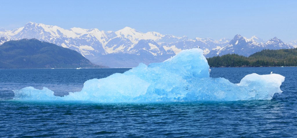 This is an untouched photo. The Chugach Mountain range is many miles away, but this beautiful blue piece of ice was just floating along the water. The captain estimated it calved from the glacier months ago, as it was several miles away from Columbia Glacier.