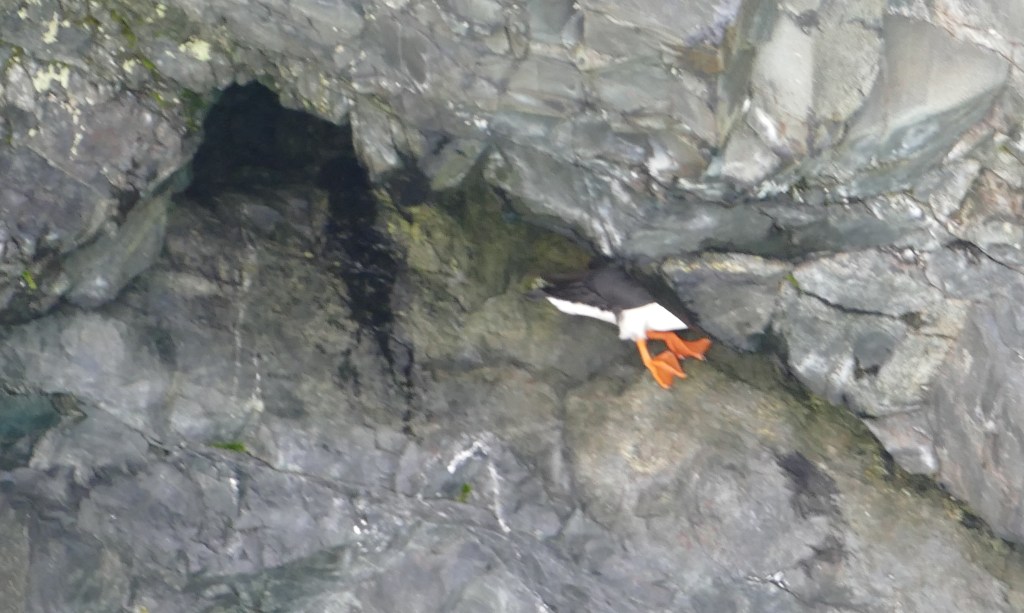 The captain was searching along the caves for birds, as that is where they like to hang out, especially the Puffin, which I really wanted to see. We did see dozens of them, but I was never able to get a clear photo. They like to hide in the nooks and crannies of the rocks, and then fly away fast. This photo is the best I could get! I call it my “butt” puffin! This is how they hang out.