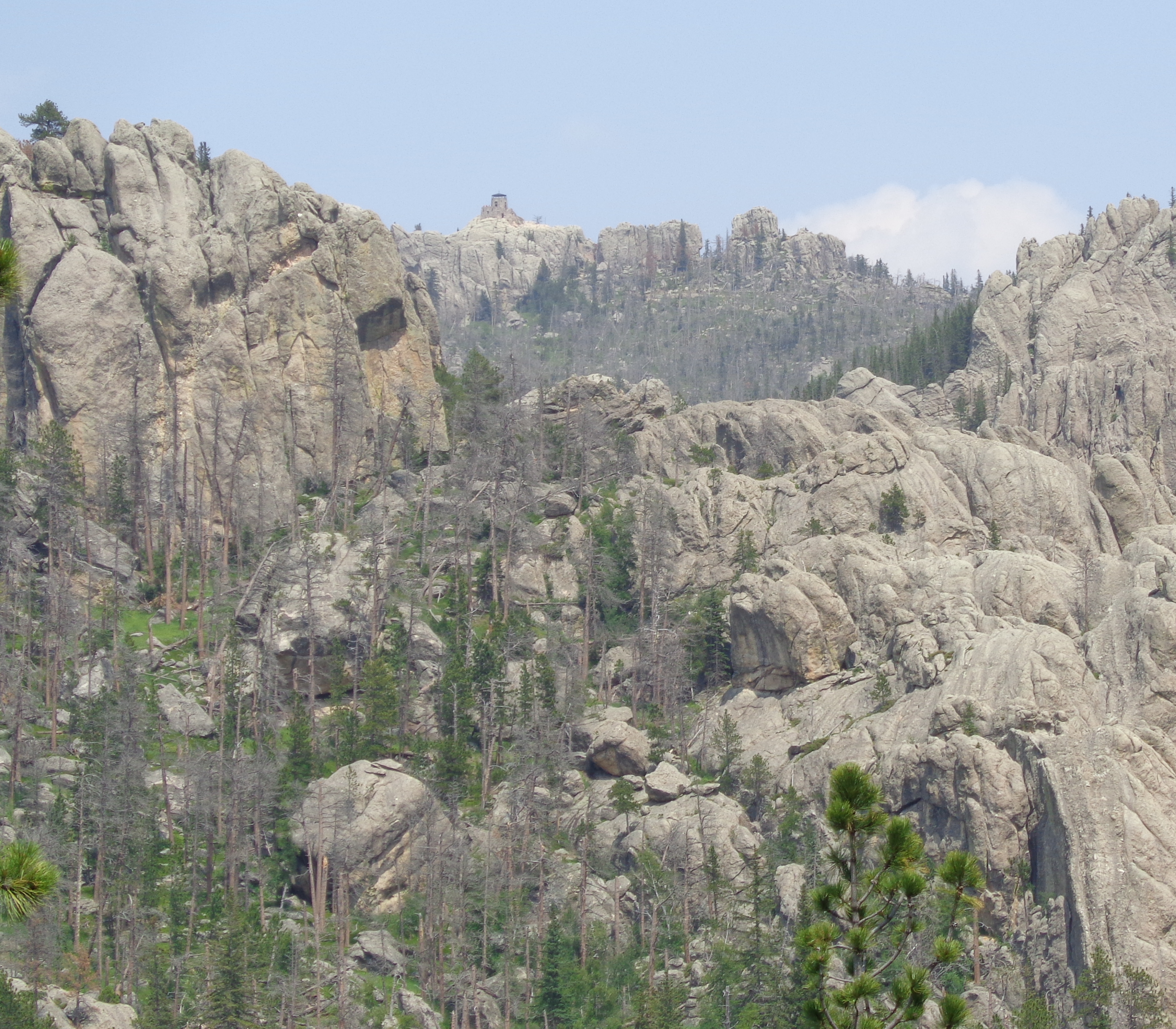 After about an hour, we got our first glimpse at the shell that remains of the fire tower on top of Harney Peak.  We all thought “we have to get all the way over there?!” (you can see our destination is at the center of the picture below)
