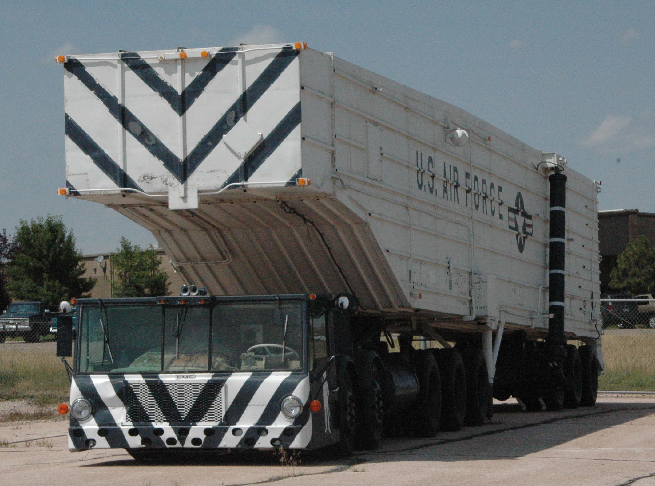 The missiles were brought to the sites using the maintenance vehicle below.  The back-end of the vehicle would raise up and over the missile site in the ground, and they could lower the missile down into the silo.